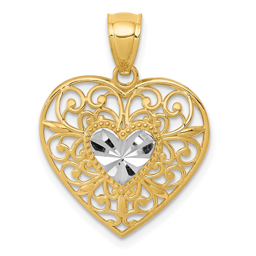 14K and White Rhodium Polished Diamond-cut Filigree Heart Pendant