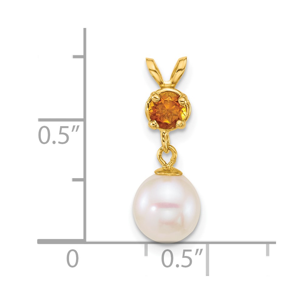 14k Polished 7-8mm Round White Freshwater Cultured Pearl Dangle and Citrine Pendant