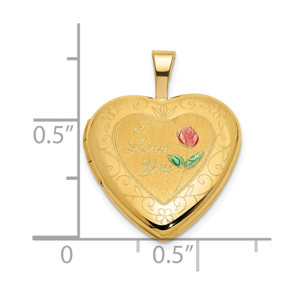 14K Polished and Satin Pink and Green Enamel Rose I LOVE YOU Script 16mm Heart Locket