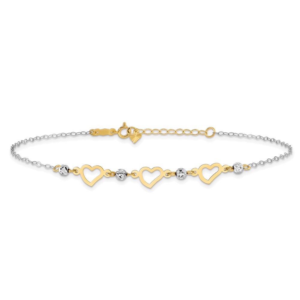 14K Two-tone Three Hearts and Diamond-cut Beads Plus Extender – Total Anklet