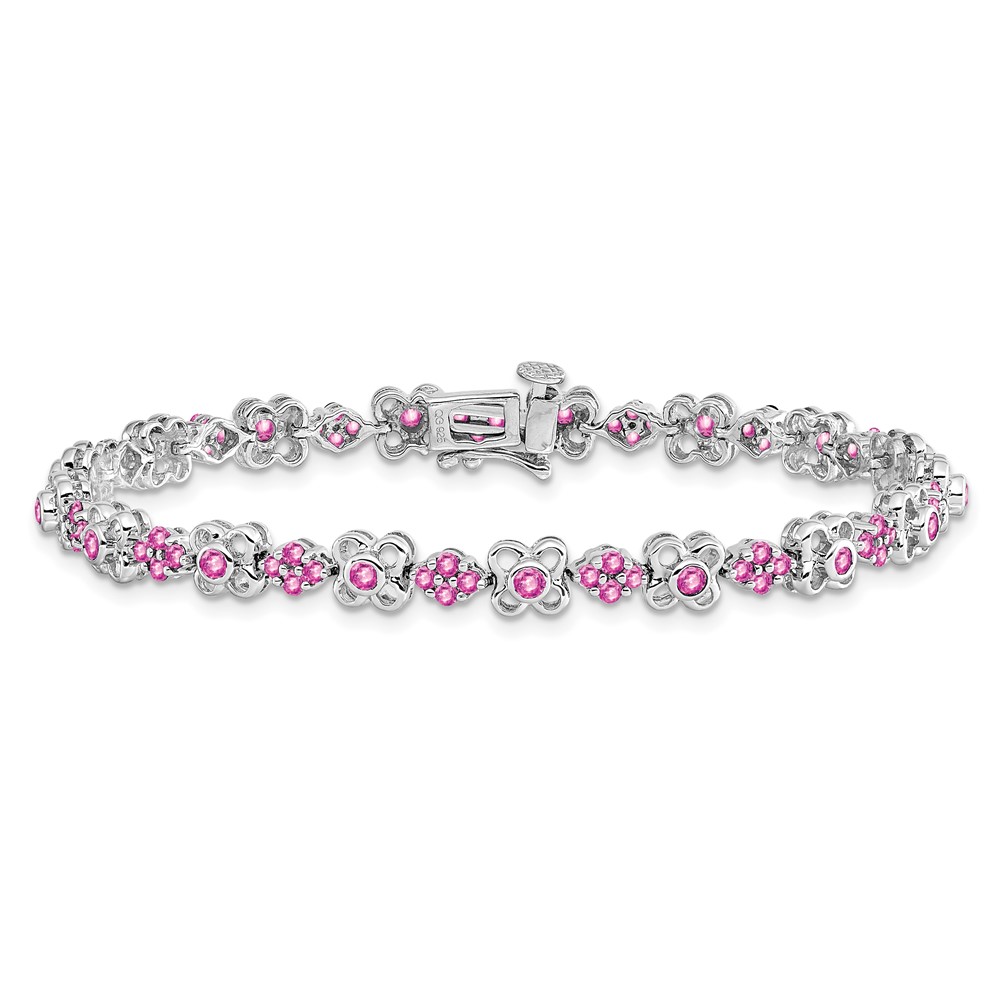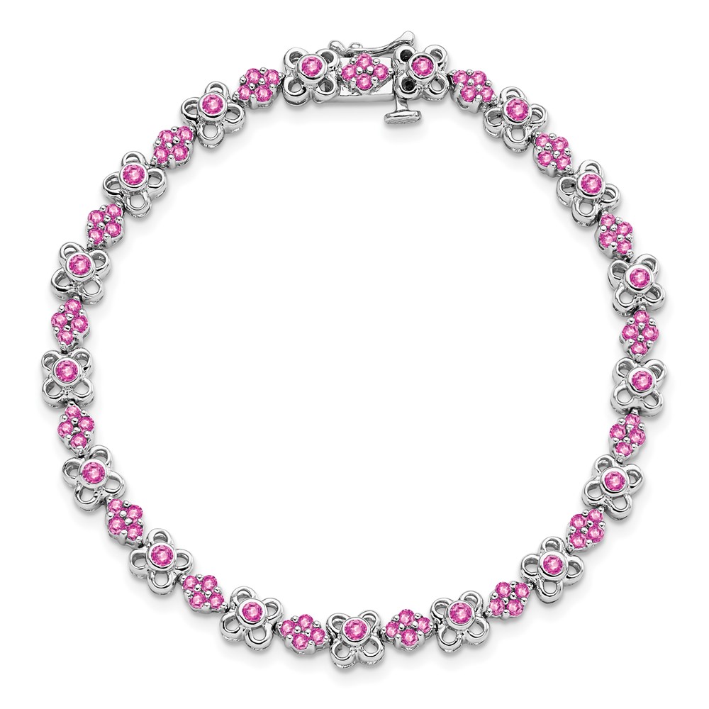 14k White Gold Complete Lab Created Pink Sapphire Flowers 7 inch Bracelet