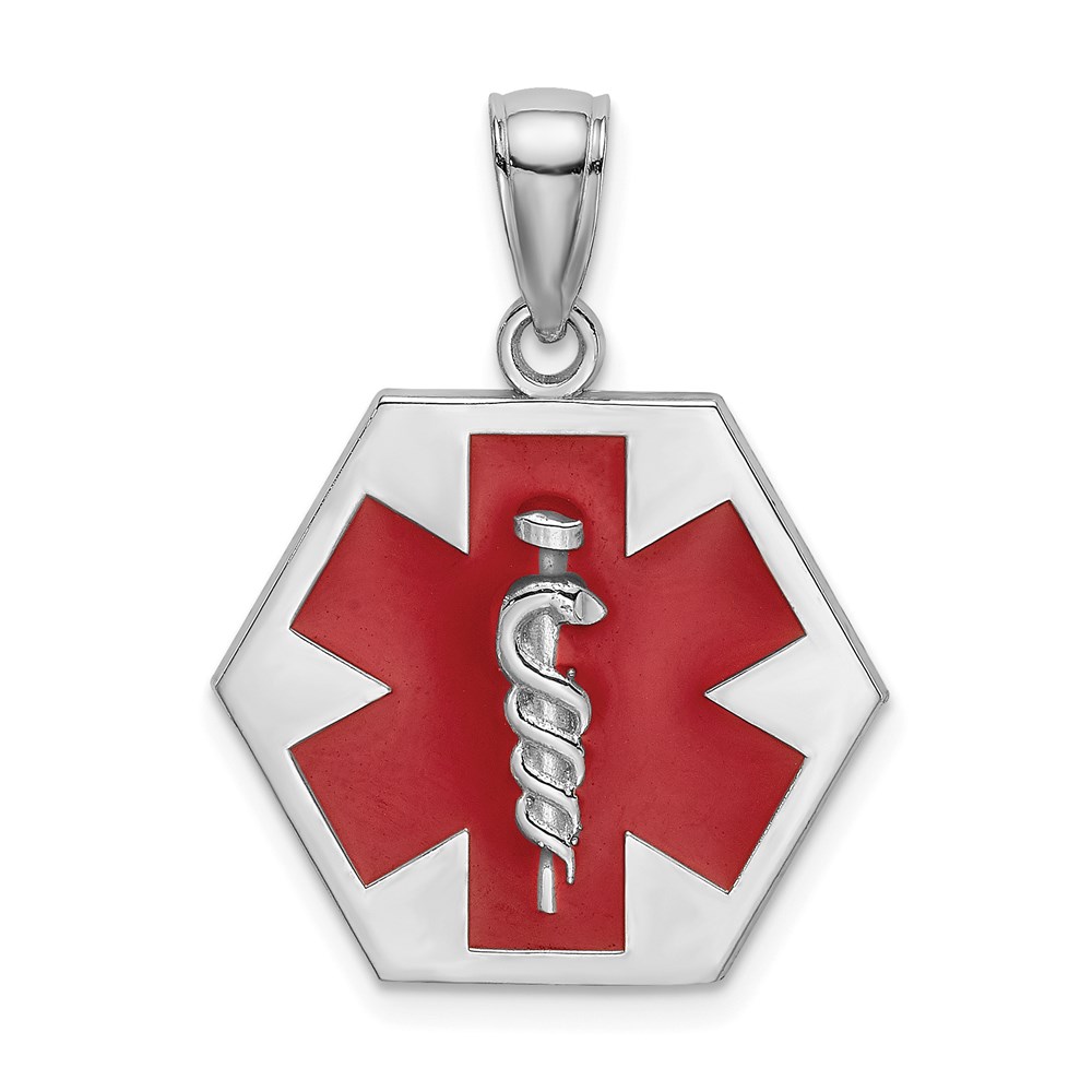 14K White Gold Red Enameled Textured Back Caduceus Medical Disc Charm