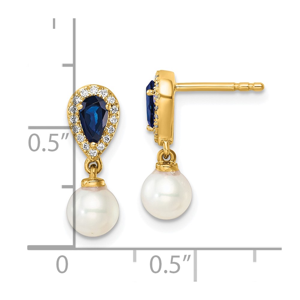 14K White Round Freshwater Cultured Pearl/.09 carat Diamond/Pear Sapphire Dangle Post Earrings
