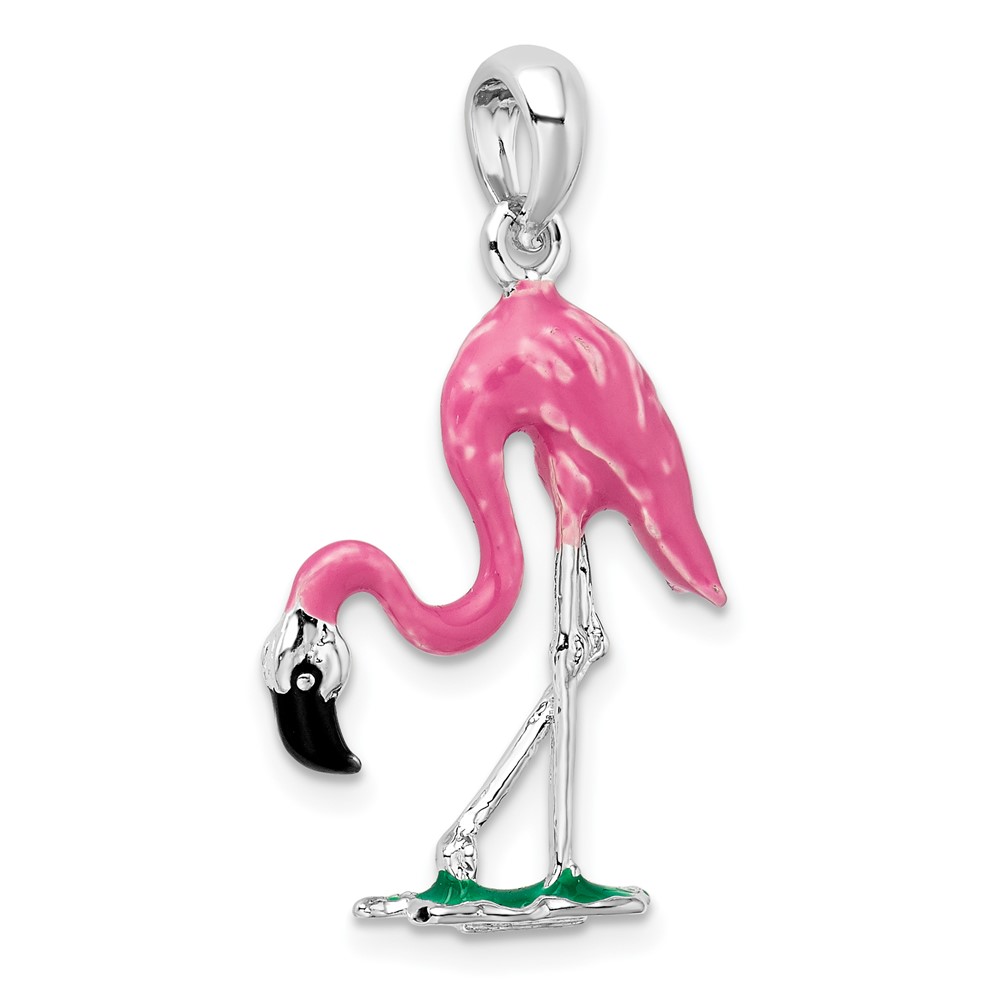 De-Ani Sterling Silver Rhodium-Plated Polished 3D Pink Flamingo Pendant