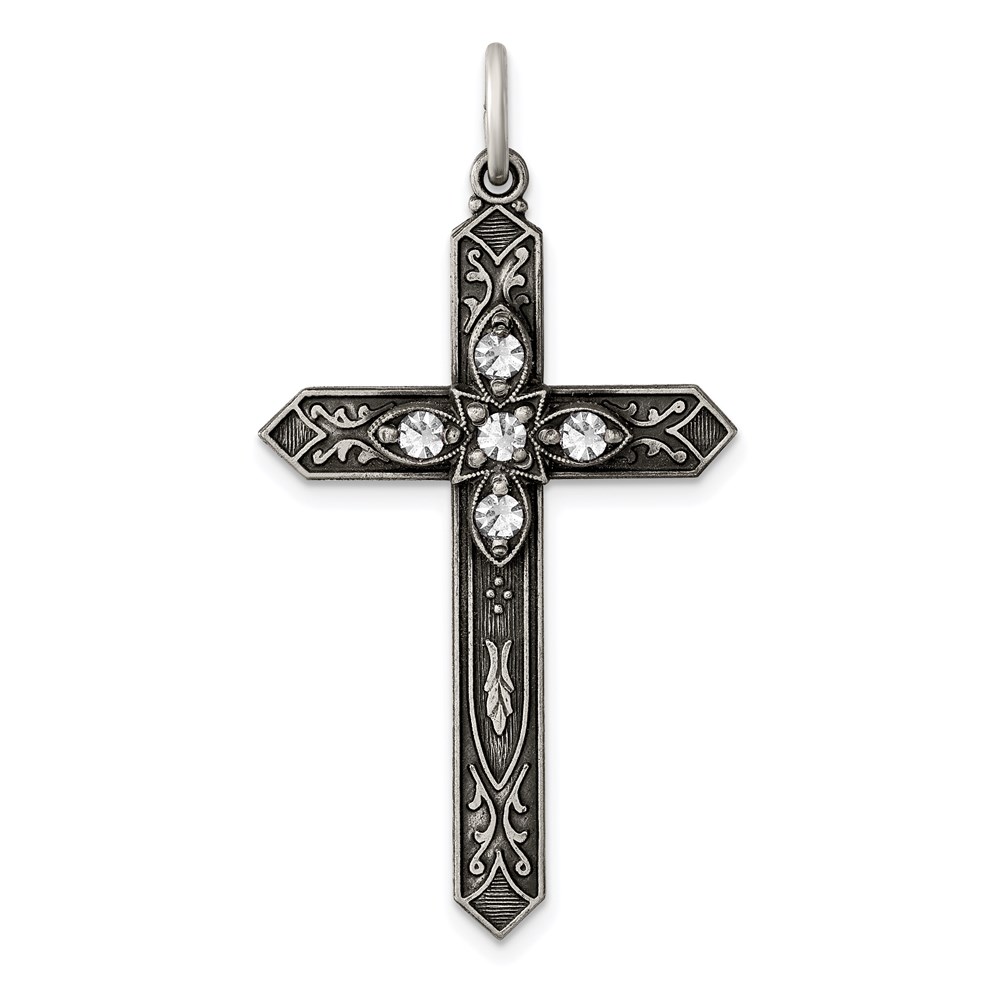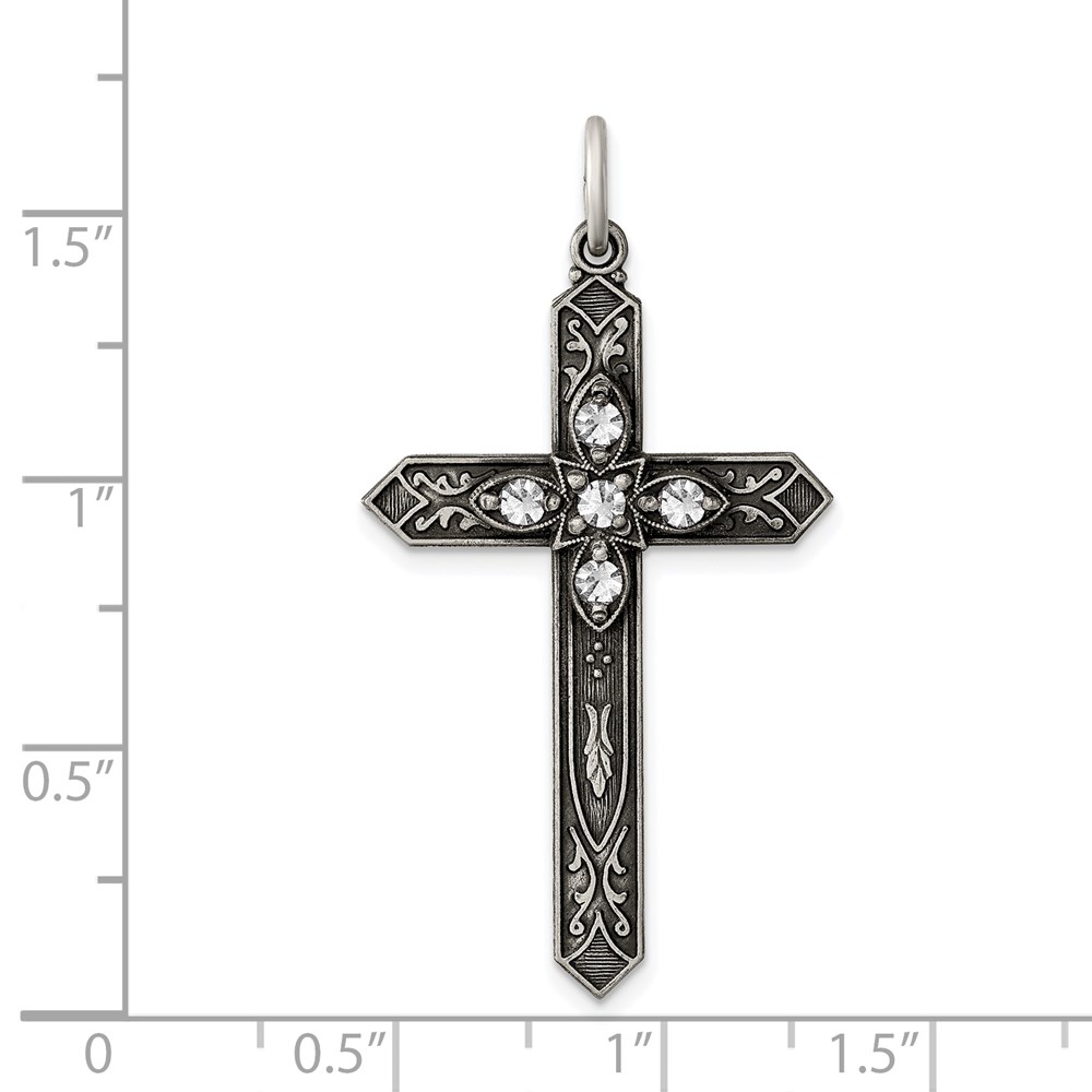 Be the first to review “Sterling Silver Antiqued April Glass Birthstone Cross Pendant” Cancel reply