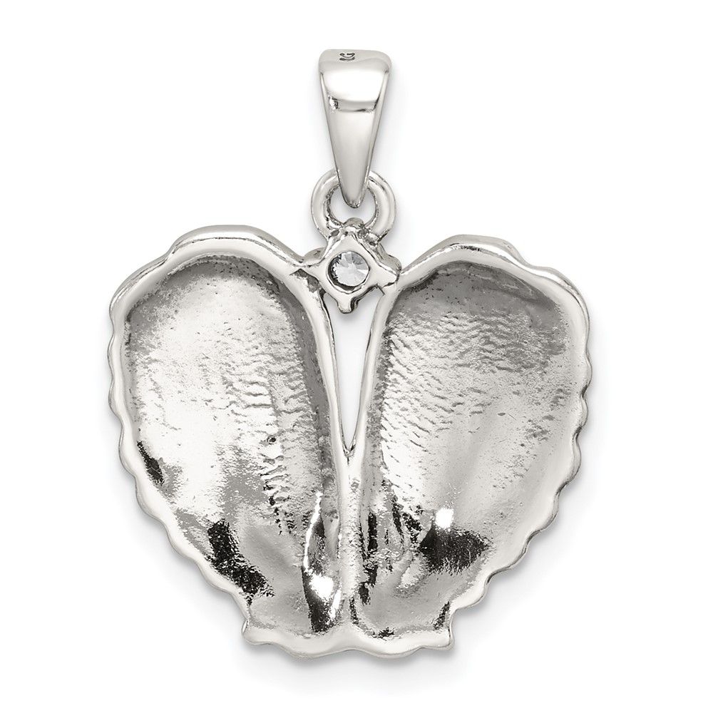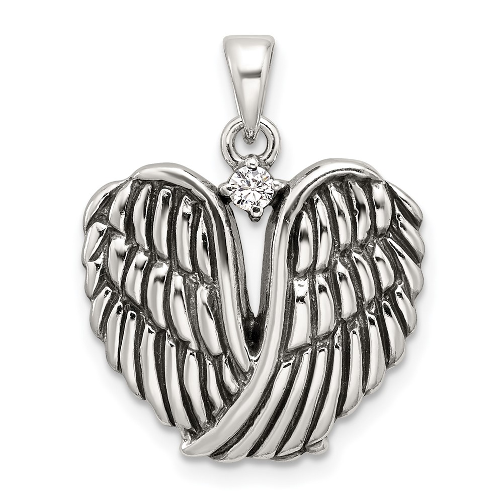 Sterling Silver Polished and Antiqued CZ Angel Wing Heart Pendant