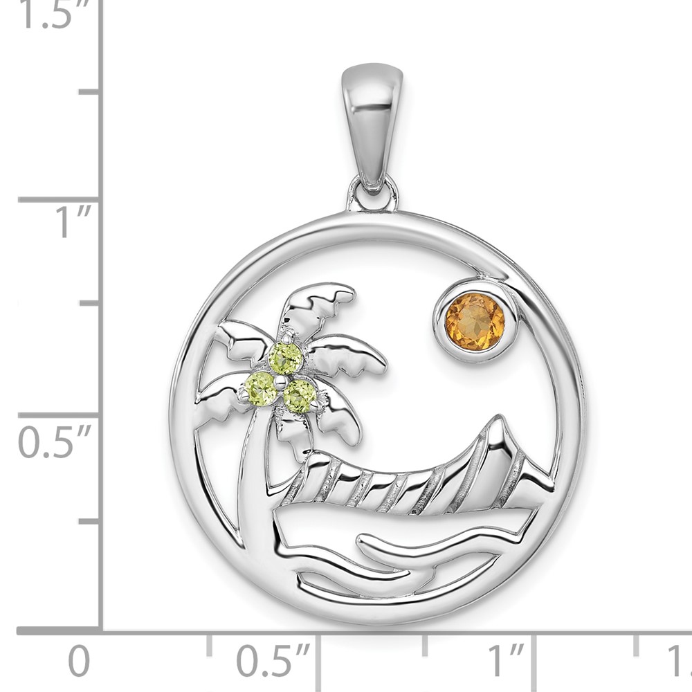 Sterling Silver Rhodium-plated Polished and Grooved Citrine and Peridot Beach Scene Circle Pendant