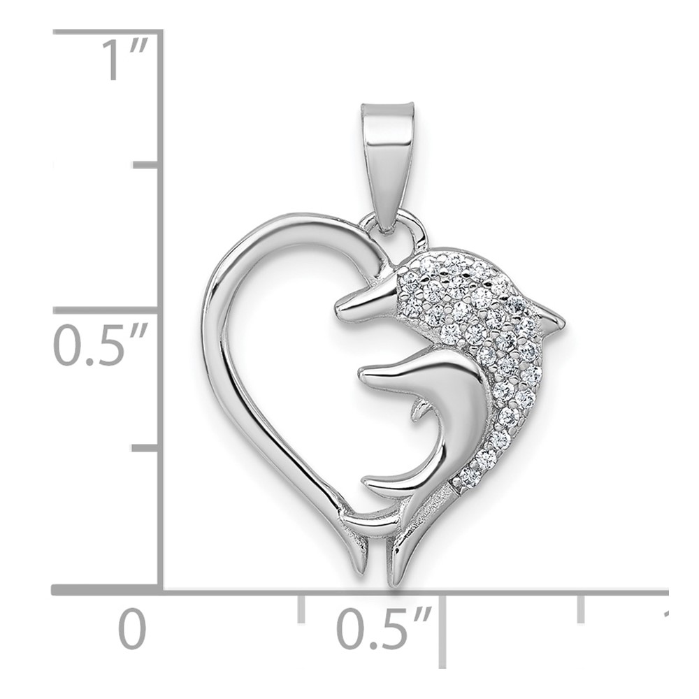 Sterling Silver Rhodium-plated Polished CZ Dolphins Heart Pendant